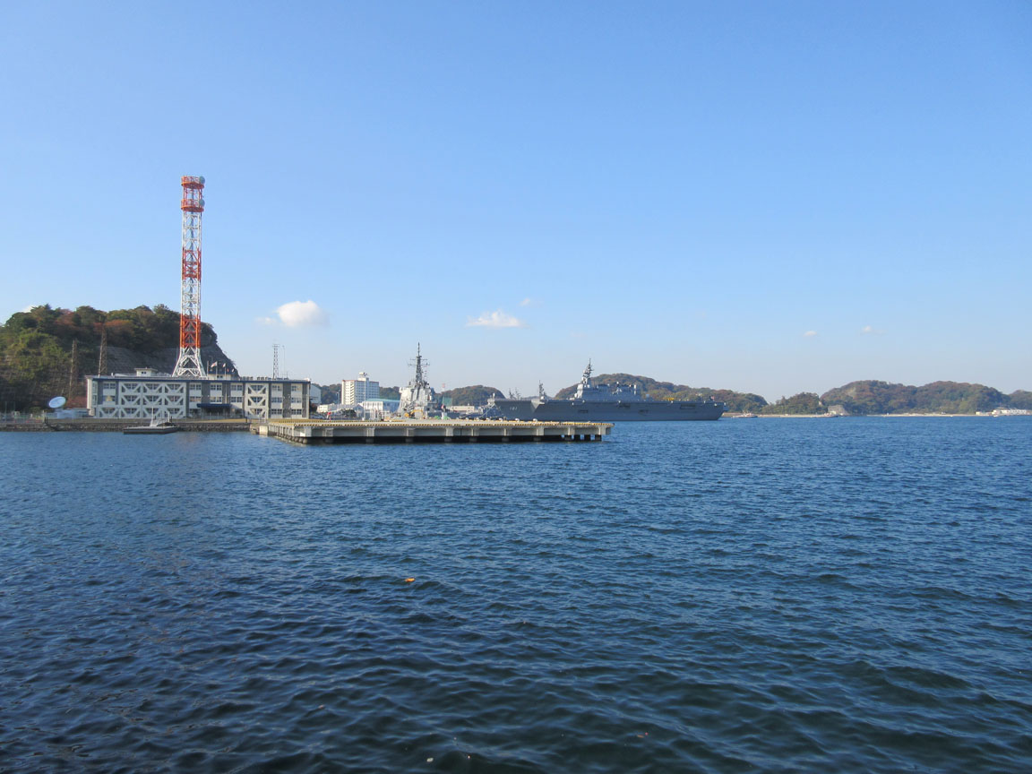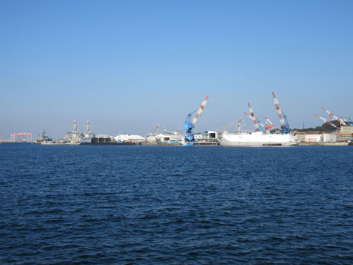 潜水艦なども見えます。左端奥のクレーンには「SUMITOMO よこすか」と書かれていました。