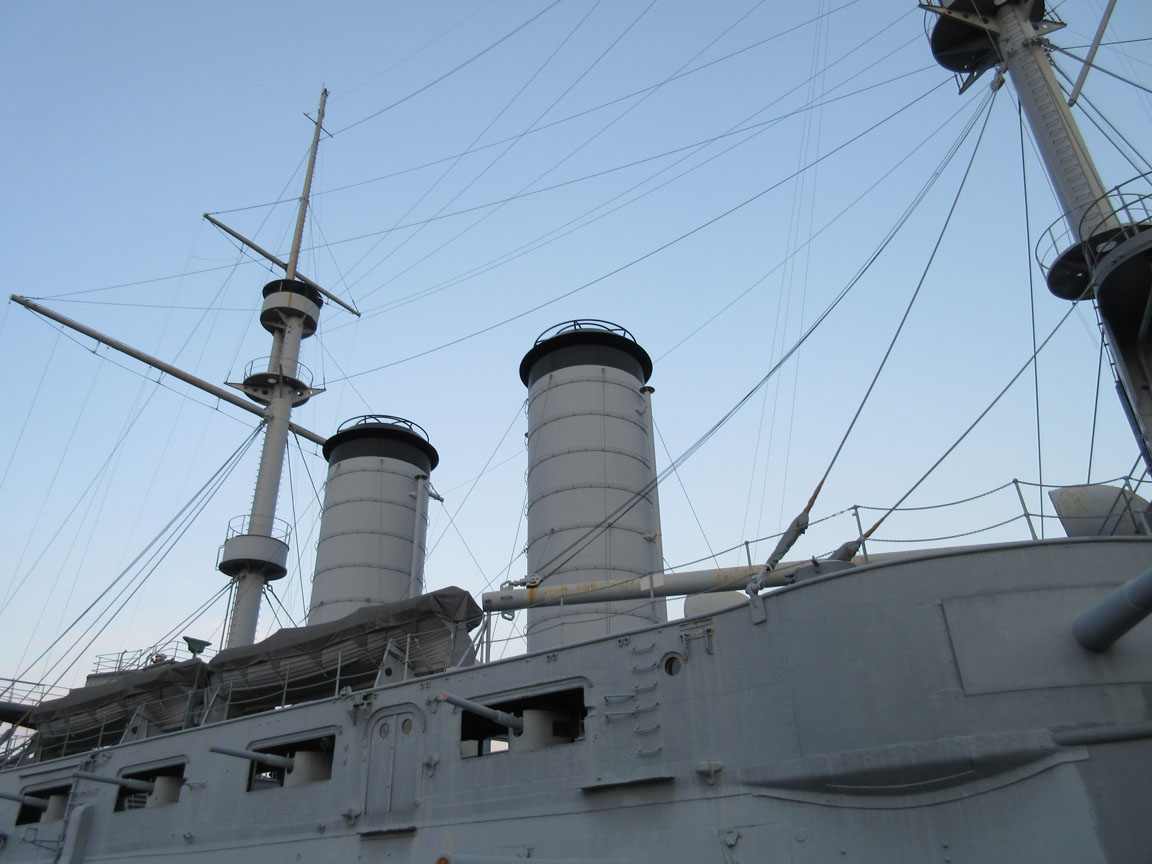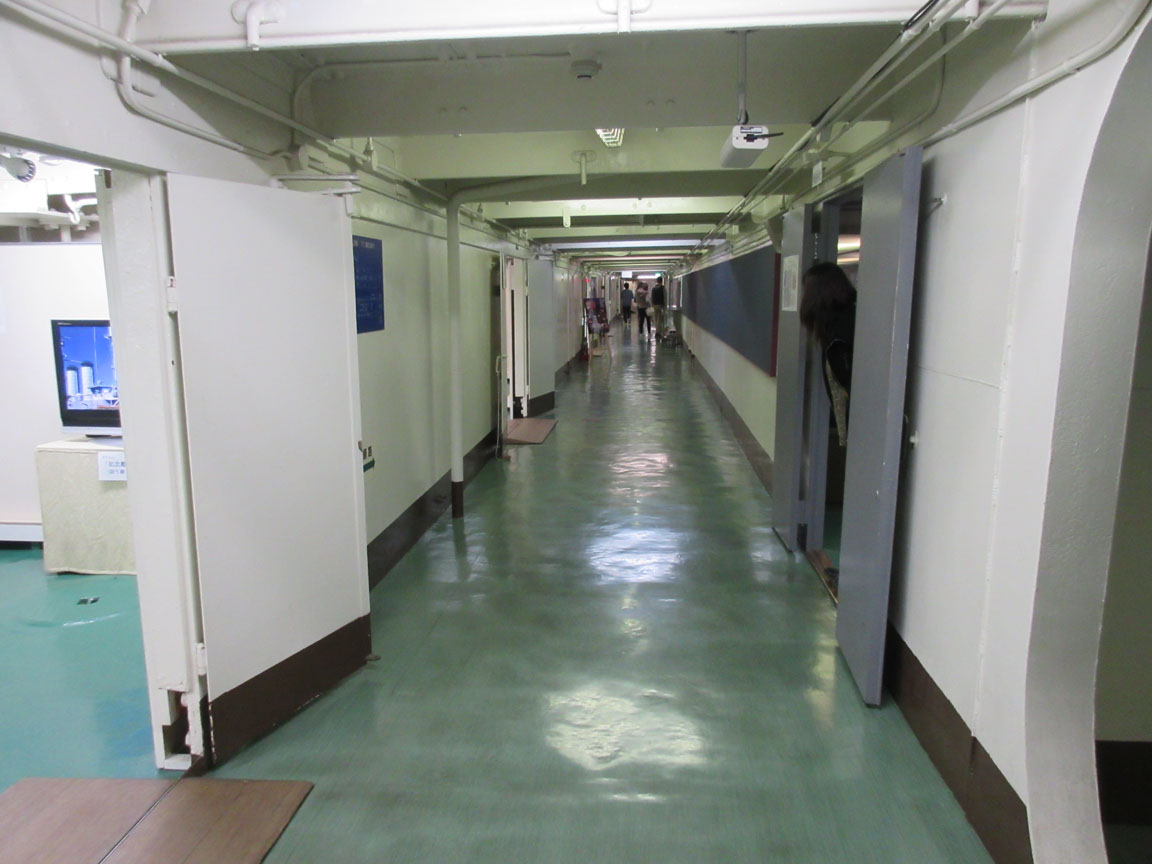 中甲板。中に入るととても広く感じます。各部屋は展示室になっていて、ビデオやバルチック艦隊との海戦を解説する可動式の模型などもあります。