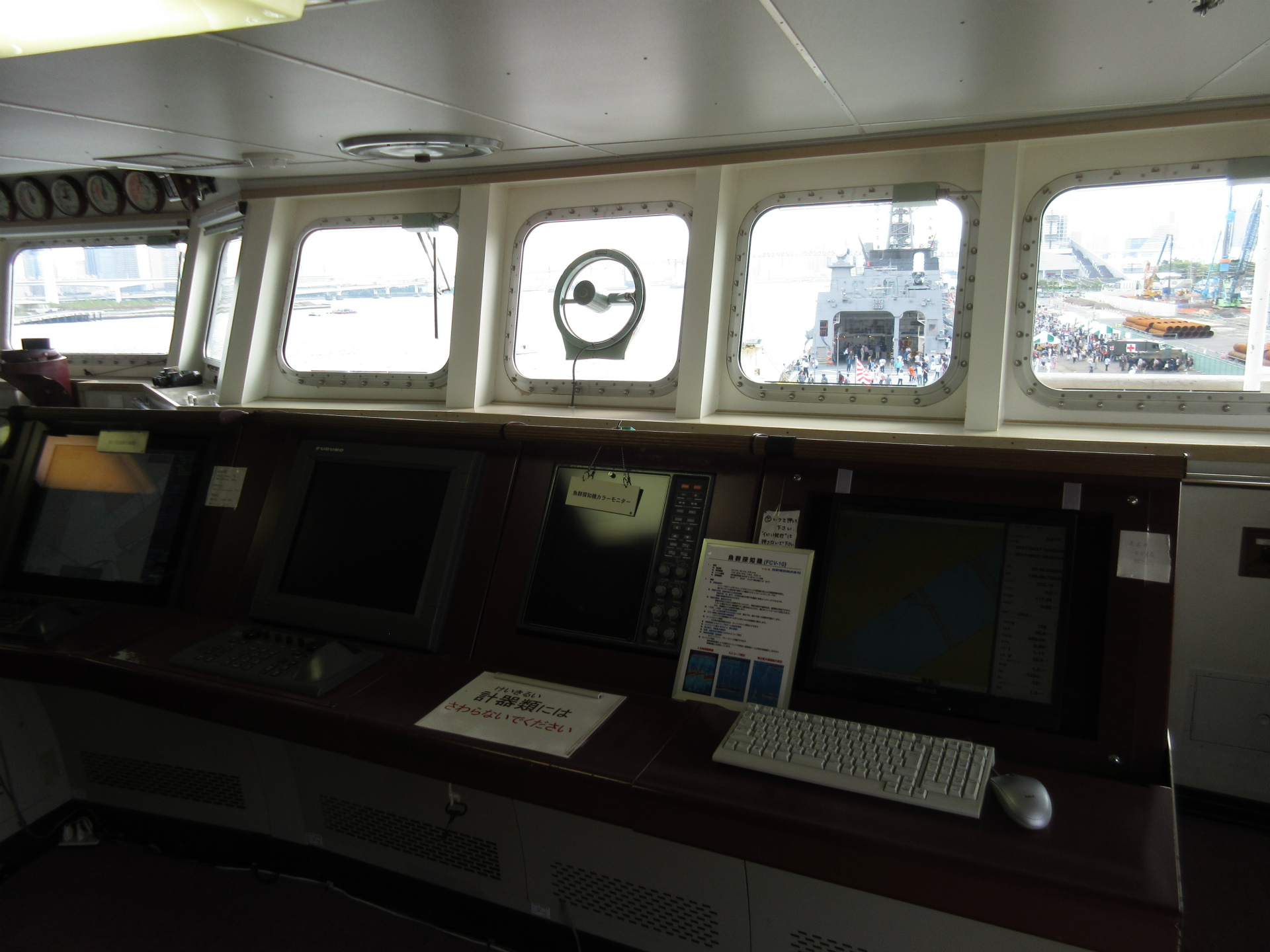 操舵室です。撮影は禁止でしたが、後方で通信機器の見学を行うこともできました。